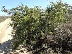 The intricately branched spreading shrub typically grows to a height of 0.6 to 2 metres (2.0 to 6.6 ft). A very dense and impenetrable species due to its extremely prickly foliage. The leaves are rigid, 4–10 cm (2–4 in) long, prominently grooved and narrow with 5-7 sharply toothed lobes. It blooms from August to October and produces large scented white to cream flowers in clusters in the leaf axils. They may appear in a raceme of up 22 flowers. The smooth to roughish fruit are ovoid 2 cm (0.8 in) long by 1.5 cm (0.6 in) wide with two distinct slightly incurving beaks.[3][4]
