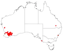 This species grows from Wyalkatchem through to Gnowangerup and south to Ravensthorpe. Grows in heath, scrub and woodland in well-drained clay, various coloured sands and loam over laterite, often with gravel, occasionally on ridges. An ornamental species, may be used for hedging and low windbreak.[3]