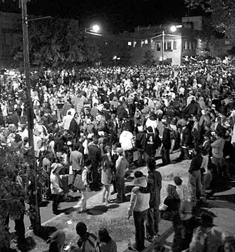 For the Town of Chapel Hill, one of the biggest concerns during the event is safety. With crowds of up to 80,000 people, security measures can be difficult to implement, with two of the biggest issues being binge drinking and gang-related activities.[1] Although the celebration is not a town-sponsored event, on average, officials call for around 400 law enforcement officers to control crowds and patrol the streets.[2] During the 2008 celebration, along with other new security measures, officials required bars and restaurants in the downtown area to stop selling alcohol and close their doors at 1:00 a.m.[3] Another action taken by town officials meant to help curb drinking was that of requiring all bars in the downtown area to charge patrons a five-dollar cover charge to get in.[5] Police began clearing the streets at midnight and made only five arrests throughout the event, down from thirteen arrests at the 2007 celebration.[6]