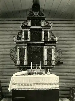 The pulpit and altarpiece are from 1725. The altarpiece is painted in oxide green with marble and silver lacquer. It was completed by Peder Knutsen Kjørsvik (1691–1757).[5] The church exterior was painted red around 1860 and then it was painted white in 1863. In 1917, the church was in poor condition, and there was a desire for a new church among the congregation. Olaf Nordhagen and Nils Ryjord were given the task of assessing the condition of the church, and this resulted in a major restoration project that was led by Domenico Erdmann and Ola Seter. The project included (among other things) removing layers of interior paint to reveal the old baroque and rococo decor from the 1751. The work was completed in 1921.[4][6]