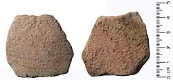 The kiln was built of limestone lined with clay. It was 8 feet (2.4 m) long and 4 feet (1.2 m) wide and fired the clay which was thrown by hand.[1] Two types of jugs have been identified. Type A, believed to date from the 12th century have a yellow splashed plain lead glaze and have a diamond pattern decorating the rim. Type B, a more recent product appears greener, due to the presence of copper in the glaze.[2] The jugs were decorated with floral patterns sometimes with identifiable animals or human figures.[3]