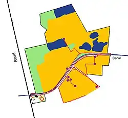 The Somerset Levels have been occupied since the Neolithic period, around 6,000 years ago, when people exploited the reed swamps for resources and started to construct wooden trackways such as the Sweet and Post Tracks,[7] and they were the site of salt extraction during the Romano-British period.[8] Much of the landscape was owned by the church in the Middle Ages when substantial areas were drained and the rivers diverted, but the raised bogs remained largely intact. Only the Inclosure Acts of the 18th century, mostly between 1774 and 1797, led to significant draining of the peat bogs, although the River Brue still regularly flooded the reclaimed land in winter.[1][9] Following the Somerset Drainage Act 1801 (41 Geo. 3. (U.K.) c. lxxii), parts of the Brue were straightened, and new feeder channels constructed.[10]