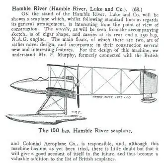 The Hamble River H.L.1 Seaplane was a British pusher biplane seaplane designed by Frank Murphy and built by Hamble River, Luke & Co Limited at Southampton.[1][2]