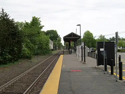 The 1862-built freight house burned down in late 2000.[9] The former depot building (which had been destroyed by vandals by 1977[10]) and platform were located on the west side of the single track. The accessible mini-high platform was adjacent to the Route 1A crossing, causing the road to be blocked whenever a train was in the station. In 2002, a new platform was constructed on the east side of the tracks some 350 feet (110 m) to the south, allowing the road to remain open while trains are stopped. The new platform opened on July 10, 2002.[3] The former platform was removed soon afterwards.
