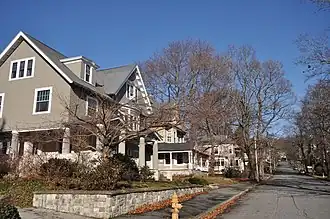 The first part of the area to be developed was Germain and Highland Streets. There are two particularly fine examples of Queen Anne architecture on Germain Street, one of which was featured in the catalog of architects Barker & Nourse. Good examples of Colonial Revival designs are found at 26 Haviland and 11 Westland Street. 28 Haviland Street is a distinctive and unusual example of Arts and Crafts architecture with touches of the Prairie School.[2]