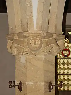 Between the two arches of the north arcade is an octagonal column. Its capital is a relief of the upper halves of four hooded figures with their arms linked. This style of lively 14th-century sculpture is more common further north in Oxfordshire,[5] including Adderbury, Alkerton, Bloxham and Hanwell.[6] At the east end of the north aisle is another relief of a human face, forming a corbel that supports a piscina.