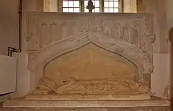 In the north aisle are 14th-century recumbent effigies of a knight in armour with a lion at his feet and a lady with a dog at her feet. The lady is in an arched, pinnacled and traceried recess bearing the arms of Poyle and another family impaling Poyle. But the recess is Perpendicular Gothic and thus later than the effigy. And it is too short for the effigy, suggesting it was made for another Poyle family monument, now lost.[5]