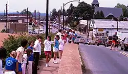 At Cape Girardeau, the route crossed the Mississippi again, then roughly followed the river's east bank through southern Illinois, Kentucky, and Tennessee.[77] Kentucky's segment included Ryan's Hope stars Christopher Durham and Malcolm Groome in Bardwell and Clinton, respectively, and Mel McDaniel and Peter Fonda at the Tennessee state line in Fulton.[78] The official midpoint of the line was in Ripley, Tennessee, where 14,000 people gathered along a three-mile stretch of U.S. Route 51 alongside Judy Collins, Brenda Lee, the Marshall Tucker Band,[79] Lynn Anderson,[2] Terri Gibbs, and General Hospital's André Landzaat.[80][81]