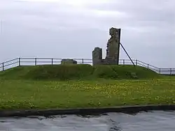 A hall was built on the summit of Hango Hill by the earls of Derby in the years following the execution of William Christian in 1663. The hall was about 10m in length, but now only about a third survives following the erosion of the coastline. Early drawings show a building with battlements, and it has been referred to as a "blockhouse"; it seems however only ever to have served as a banqueting hall and a summerhouse, and it was associated with horseracing organised by the Earls along the dunes to the east onto Langness – the first "Derby" races.[5]