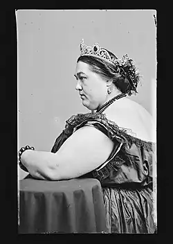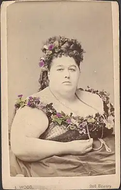 She was often reported to have rivalries with other Fat Lady performers, including Kate Keithley and Big Winnie Johnson.[8] As part of her nationwide touring, Battersby reportedly participated in a "Fat Ladies' Convention" in October of 1886 and was frequently advertised as the fattest woman in America.[9] Performers' weights were generally exaggerated for effect, so it is likely that Battersby weighed significantly less than advertised.[10]