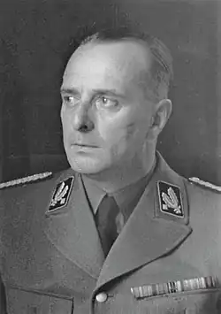 Rauter first met Adolf Hitler in August 1926 in Munich. He joined the Nazi cause in Austria in November 1931. His forays in Austria forced him to flee to Germany in July 1933, where he became part of the Nazi Party department for Austria. He joined the Sturmabteilung (SA) on 23 November 1933, was assigned to SA-Obergruppe XI, and was active in planning illegal activities in Austria. He was confirmed in the rank of SA-Obersturmbannführer in November 1934. On 27 February 1935, he transferred from the SA to become a member of the SS (SS number 262,958) and was granted the rank of SS-Oberführer. Rauter became a German citizen on 7 May 1935. From April to June 1936, he was posted to the SS Main Office and, from June 1936 to November 1938, he was assigned to the staff of the Reichsführer-SS. From November 1938 to June 1940, he was the chief of staff of SS-Oberabschnitt Südost (Main District Southwest) in Breslau.[1] On 27 October 1938, he was appointed to fill a vacancy as a Nazi deputy to the Reichstag from the recently renamed Ostmark.[2]