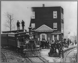 On April 21, 1865, the nine-car funeral train of President Lincoln left the Baltimore & Ohio Railroad (B&O) station in Washington at 8:00 a.m., arriving at Baltimore's Camden Station at 10 a.m. on the B&O.[5] After public viewing of the President's remains in Baltimore, the train departed on the Northern Central at 3 p.m. and passed Hanover Junction at 5:55 p.m., arriving in Harrisburg at 8:20 p.m., after a brief stop at York.[4][6][7] The next morning, the train left Harrisburg for Philadelphia at 11:00 a.m. It continued on its trip to Springfield, Illinois, for the burial, via the cities of New York, Albany, Buffalo, Cleveland, Columbus, and Indianapolis.