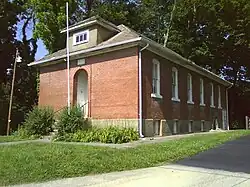 In 1923, a new one-room school building was completed adjacent to the church. It offered elementary education through eighth grade, entitling graduates admission to any public high school in Missouri. During the years of operation (1924–1955), enrollment reached a high of 42 students. The 22-by-50-foot (6.7 m × 15.2 m) building was built by Will Savers, a local contractor, after members of the congregation had dug the basement with picks, shovels, and horse-powered slip scrapers. The red brick school with 12-inch (300 mm) walls exhibits the same high quality of workmanship found in the church. The school's rectangular plan and symmetrical front with a single, centered door facing the road on the short side of the building are basic vernacular design elements found nationwide.[8] The round-arched doorway with date stone above echoes the church building's entrance. Segmentally-arched windows on the side elevations conserve a 19th-century form favored by German builders long after straight lintel-headed openings were commonplace in non-German structures. The low-hipped roof with dormer and overhanging eave, however, indicate stylistic influence of the bungalow, as seen nationally in 1920s rural school architecture.[9] A20-foot (6.1 m) addition to the east end of the school in 1935 provided stage space for the Hanover Dramatic Club. The imperceptible joining of the addition to the school is testimony to the skilled hands of local masons as is the well-proportioned arch which houses a cistern on the south side of the building.