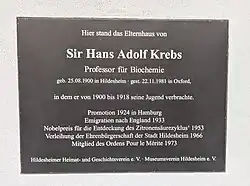 The University of Oxford had a building named Hans Krebs Tower, which was occupied by the Department of Biochemistry. In 2008, a new building for the Department of Biochemistry was constructed, on which a plaque was placed on 20 May 2013 by the Association of Jewish Refugees.[50] The plaque was unveiled by John, Lord Krebs, and the inscription reads:[51]