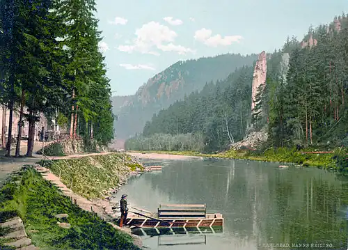 The legends originate from German inhabitants of Loket (now in the Czech Republic). He was allegedly the son of a water sprite from the river Ohře who taught him to master magic and command spirits. Once he had become rich and powerful, he ordered the spirits under his command to build a great city. The granite rocks above the Ohře, named Hans-Heiling-Felsen in German and Svatošské Skály in Czech, were believed to be the ruins of this city.[1] When Hans Heiling discovered that he could not achieve human happiness even with his supernatural powers, he discarded them and died fighting a bear. Another variant of the story is that the rock formation is a petrified wedding party. A notable opera of the same name was inspired by the tale.