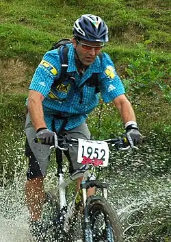 Hansjörg Rey, aka Hans "No Way" Rey (born 4 June 1966) is a pioneer in mountain bike trials and extreme mountain biking also known as Freeride /"Freeriding". Rey began riding in the late 1970's, since 1987, he has ridden exclusively on GT bikes. In 1999, he was inducted to the Mountain Bike Hall of Fame.
