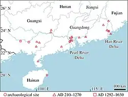 Subfossil evidence as well as historic documents all indicate that Hanyusuchus inhabited what is now South China, with subfossils found in Jiangmen and Foshan (Guangdong District). Much of the known material has been subjected to accelerator mass spectrometry radiocarbon dating, revealing their age to roughly correlate with the Bronze Age approximately 3300 to 2900 BP. The osteoderms were not analyzed by Iijima and colleagues, however older research estimated their age to be 5000 to 4900 BP. Historic reports are notably more recent, dating from the Han dynasty (specifically 210–127) to possibly as recent as the Ming dynasty (ca. 1630). The reports gathered from South China indicate their presence ranging from at least Nanning in the west to the Han River delta in the east. Reports are also known from the northern parts of Hainan Island.[1]