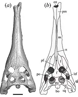 Hanyusuchus was a large, slender snouted crocodilian generally resembling the modern false gharial. Each premaxilla contained five teeth, followed by sixteen teeth in each maxilla and eighteen in the dentary. The pterygoid bone of Hanyusuchus is occupied by a series of enlarged sinuses thought to be homologous to the enlarged posterior chamber of the pterygoid bulla seen in extant gharials. The structure is however expanded towards the back of the skull in a novel way, increasing the morphological variety of the bulla. However, as parts of the palate are broken in Hanyusuchus, it cannot be determined whether or not it had the anterior chamber. These chambers are internally connected to the nasopharyngeal duct and, depending on the length of the chambers, are used to change the harmonics of vocalisations. In modern gharials the pterygoid bulla is tied to ontogeny and sexual maturity in males and coupled with the growth of a soft tissue structure (ghara). In combination, the bulla serves to alter sounds, while the ghara exaggerates it, which is used in attracting mates. Although no indication for a ghara is described Hanyusuchus, the enlarged sinuses show a clear adaptation towards an acoustic function. This is supported by contemporary description telling of crocodiles making "thunder-like sounds in the night".[1]