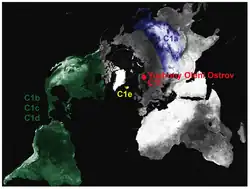 - ^ Der Sarkissian, Clio; Brotherton, Paul; Balanovsky, Oleg; Templeton, Jennifer E. L.; Llamas, Bastien; Soubrier, Julien; Moiseyev, Vyacheslav; Khartanovich, Valery; Cooper, Alan; Haak, Wolfgang (2014). "Mitochondrial Genome Sequencing in Mesolithic North East Europe Unearths a New Sub-Clade within the Broadly Distributed Human Haplogroup C1". PLOS ONE. 9 (2): e87612. Bibcode:2014PLoSO...987612D. doi:10.1371/journal.pone.0087612. PMC 3913659. PMID 24503968.