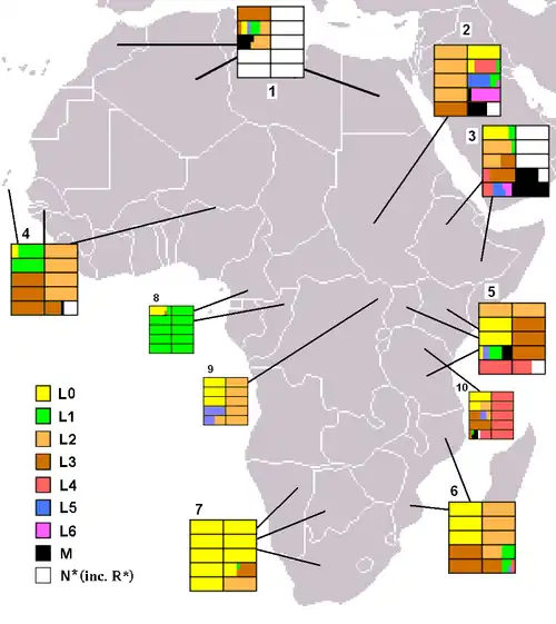 - ^ a b Gonder MK, Mortensen HM, Reed FA, de Sousa A, Tishkoff SA (March 2007). "Whole-mtDNA genome sequence analysis of ancient African lineages". Molecular Biology and Evolution. 24 (3): 757–68. doi:10.1093/molbev/msl209. PMID 17194802.
