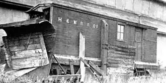 The finished railroad had 43 curves with a maximum curve of 21 degrees. Stub switches were used throughout. The two main-line switchbacks were dubbed the Thomas and Fletcher switchbacks. There were nine unprotected grade crossings of roads.[8]: 9  Although the State Railroad Commissioners were critical of the condition of the railroad, particularly its safety features, in their 1899 inspection report, it was allowed to operate because it was designed and intended to be a low-speed freight handler.[8]: 8–9 [5]: 3  Despite official concerns, there were no train collisions on the railroad, and its injury and fatality record was better than the Vermont statewide average.[26]: 29  However, the railroad’s use of link-and-pin couplers meant that the brakemen had the most dangerous work on the railroad, and several were killed or injured.[26]: 29–30  The first operational fatality was in 1901[27] (another had occurred during construction[26]: 29 ). In July 1904, three flatcars, loaded with grout, ran down the mountain, crashing into the engine house and wrecking Locomotive No. 2, a flatcar, and the engine house; this appeared to be the work of vandals who released the cars’ brakes.[26]: 30  Derailments were a frequent occurrence on quarry, mine, and timber railroads because of the light rails, sharp curves, and scanty ballasting often used in their construction; the H&W saw multiple derailments. Rerailer frogs, essentially ramps to get a derailed car’s wheels back on the track, were always carried on trains.[26]: 30