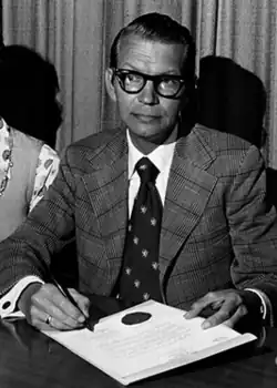 He served as a Staff Sergeant in the Air Force during World War II, where he was shot down by German soldiers and captured as a Prisoner of War in 1945, for which he was awarded a Prisoner of War Medal.[1] In 1954 Swenson started in the business of tourism, owning a travel agency on Third Street. From this he was appointed the first director of the Travel and Vacation Bureau of the Pennsylvania Department of Commerce in 1959 under Gov. George M. Leader and then David L. Lawrence, a job which he held for 8 years. He created and implemented what is now known as the Tourist Promotion Agency Fund.[2] During this time he also met his wife Elsie, and together they continued to run their business until 1970.[3] In 1969, Swenson won the Mayoral race in Harrisburg in an upset against the Harvey Taylor machine and took office in 1970, becoming the first elected Democrat in 58 years. The Patriot News reporter Paul Beers wrote that within his first month he "established his magisterial presence, and within the first year he was regarded as the mayor of the entire Harrisburg area, invited to cut many of the ribbons in suburbia."[3] At that time, his salary for Mayor was only $15,000, and his wife Elsie was earning more.[4] Swenson was praised for navigating and calming anxieties after the 1969 Race Riots, Harrisburg Seven Trial, and then Flood of 1972 caused by Hurricane Agnes. In a daring investment of the City, he championed Harristown redeveloping Downtown with Strawberry Square. It was widely noted that he put managing before politics, and retained competent workers at City Hall regardless of party.[4] Some criticized him of weak Democrat allegiance, calling him a "Republicrat," but in 1973 he was reelected for a second term, and promptly assisted in establishing the Capital Area Transit with the folding of the Harrisburg Railways.[3] Following his Mayoral tenure, Swenson was President of the Rotary Club of Harrisburg from 1983-1984.[5] Together with his wife, they established the Harold and Elsie Swenson Fund with the Greater Harrisburg Foundation to support the Harrisburg park system.[6] Following his passing in 1995, the Swenson Plaza was dedicated to him by Mayor Stephen R. Reed (who hired Swenson as a budget consultant upon being elected) in 1999 at the base of the Walnut Street Bridge.[7]
