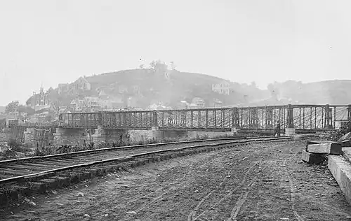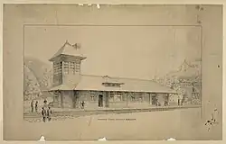 The railroad bridge was destroyed during the Civil War and rebuilt on the same piers. Despite a growing recognition that the outdated bridge and sharp curves were an impediment to operations, the B&O did not begin work on a replacement until 1892.[4]: 12 A tunnel was bored through Maryland Heights, allowing a new double-track bridge to be built with gentler curves. The tracks through Harpers Ferry were realigned further inland across the former armory site.[4]: 13–19 The B&O constructed a new station at the junction between the relocated main line and the W&P, replacing an older passenger station.[4]: 19 It was a 101-by-21-foot (30.8 m × 6.4 m) one-story wooden structure with a two-story tower at one end. It opened in fall 1894.[4]: 25–30 The station was designed by E. Francis Baldwin, who was the architect for a number of B&O stations in that era.[4]: 20–24