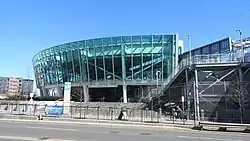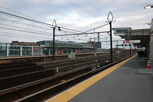 The westbound platform of the new station opened to the public on October 30, 2018.[16][17] On June 15, 2019, the eastbound head house and platform of the new station opened to the public completing the first two of the four-phase project of the station reconstruction.[18] Following the new eastbound platform's opening, the older existing entrances on the west side of Frank E. Rodgers Boulevard were expected to be demolished by December 2019 for the third phase to make way for similar new headhouses,[19] but no action was taken until April 12, 2021, when the Pennsylvania Railroad station headhouse to the eastbound platform was closed and subsequently demolished.[20]