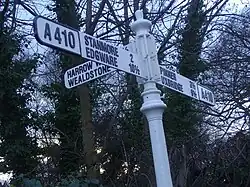 Ancient woodland on high ground fills most of the northern part of Harrow Weald on the border of Greater London (and the traditional county of Middlesex) with Hertfordshire. The area is one of the highest in Greater London; the highest point in Middlesex is near the woods at 502 feet (153 m). The eastern part of the woods merges into those of Stanmore and encompasses Bentley Priory. The priory's grounds are now Bentley Priory Nature Reserve, a biological Site of Special Scientific Interest. Along the southern edge of the high ground runs the road Old Redding and a car park here gives views over parts of London. The western part of the woodland forms Harrow Weald Common, which adjoins Harrow Weald SSSI, a geological Site of Special Scientific Interest. Other smaller woods surround the Grim's Dyke Hotel, the former country house of W. S. Gilbert.[3] Gilbert and Sullivan's comic operas are frequently performed here. The house is named after the nearby earthwork Grim's Ditch, a 3-mile (4.8 km) long ancient monument that runs from Harrow Weald to Pinner Green. The monument remains largely mysterious but is known to have been named in the Saxon era.[4] The ditch hints at a long history of habitation in the area and many artefacts have been found on the common to support this.
