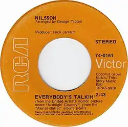 Pandemonium Shadow Show was followed in 1968 by Aerial Ballet, an album that included Nilsson's rendition of Fred Neil's song "Everybody's Talkin'". A minor US hit at the time of release (and a top 40 hit in Canada), the song would become more popular a year later when it was featured in the film Midnight Cowboy, and it would earn Nilsson his first Grammy Award.[15] The song would also become Nilsson's first US top 10 hit, reaching No. 6, and his first Canadian #1.[17]