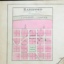 Hartford was laid out about 1817.[2] In its peak years, Hartford was a point on the stagecoach route from Madison to Aurora.[3] Before the flood of 1937 there were four mills, and a general store which opened up in 1978 and closed in the mid-1980s.