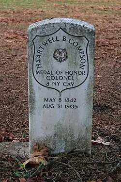 Compson was born May 5, 1842, in Seneca Falls, New York, the second of thirteen children born to Jonas and Ruth Compson. He volunteered for the 8th Regiment New York Cavalry in September 1861.[1] Rising rapidly through the ranks, he eventually became regimental commander. On March 2, 1865, he led his troops into battle at Waynesboro, Virginia. During fierce hand-to-hand combat, Major Compson personally captured the headquarters flag of Confederate general Jubal Early. For this action he would receive the Medal of Honor. In addition, Compson was breveted to colonel by General Philip Sheridan. Unlike many of the men whose bravery was not recognized for decades, Compson received his medal within a month of the battle. After mustering out in June 1865, Compson worked as a U.S. Marshal and Postmaster and eventually moved to Oregon where he became Brigadier General of the Oregon National Guard. He died on August 31, 1905, in Portland, Oregon, where he is buried in the Grand Army of the Republic Cemetery. Following his death in 1905, Compson faded from memory and his grave went unmarked for 100 years until Civil War amateur historians Roy Vanderhoof and Mike Stephenson, along with the considerable assistance of Congresswoman Darlene Hooley of the 5th Congressional District, obtained a proper headstone from the Federal Veterans Administration.