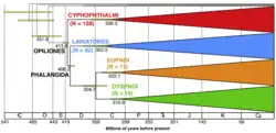- ^ a b c d e f g Gonzalo Giribet; Adriano B. Kury (2007). "Phylogeny and Biogeography". In Ricardo Pinto-da-Rocha; Glauco Machado; Gonzalo Giribet (eds.). Harvestmen: the Biology of Opiliones. Harvard University Press. pp. 62–87. ISBN 978-0-674-02343-7.