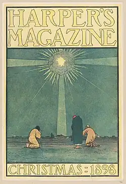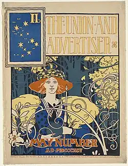 As the economic Panic of 1893 swiftly enveloped the country, architectural offices in Missouri and everywhere else were diminished or closed, and that year Ellis's midwestern sojourn ended. He returned to Rochester and the practice his brother had maintained that then became known as Charles S. Ellis and Harvey Ellis, Architects. Most of their commissions at this time apparently were similar to the kinds of modest projects that they had started with sixteen years earlier. Their names are known, but there is little visual information about them. Painting and graphic design, not architecture, became Ellis's main intellectual focus after he returned to Rochester. His technical skills enabled him to master different pictorial modes of the day: traditional generic illusionism, Tonalism, Japonism, the more abstract precepts of Arthur Wesley Dow and, via Dow, the avant-garde art of Paul Gauguin. In 1897 several of Ellis's architectural designs began to reflect English Arts and Crafts architectural trends, and that same year he was one of the founders of the Rochester Arts and Crafts Society, apparently the first such organization in the country. For the rest of his life he was immersed in the American Arts and Crafts movement.[5]