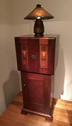 A mahogany music cabinet with maple inlays designed by Harvey Ellis and built by Craftsman Workshops, approximately 1903. The lamp was made by Old Mission Kopper Kraft. On display at the de Young Museum in San Francisco.