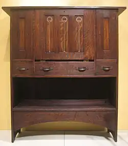 The view of Ellis as designing the "golden age" of Stickley furniture is widespread. During Ellis' tenure, Craftsman designs showed a "lighter note"[7] than later "blunt, straightforward, and unadorned"[8] pieces after his death. A signature feature of the Ellis period is the use of purely decorative inlays,[7][9] that disappear afterwards. He also introduced curved lower edges to horizontal rails that visually lightened Stickley's earlier designs.[10] This "light touch"[11] has been described as the influence of both Voysey[7] and Mackintosh.[11]