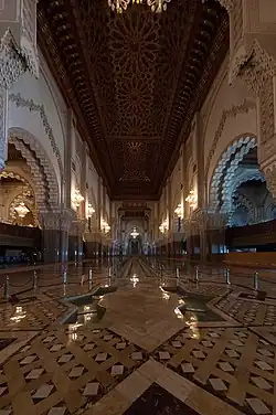 The prayer hall is built to a rectangular plan of 200 metres (660 ft) length and 100 metres (330 ft)[20] width with three naves, which are perpendicular to the qibla wall. The central nave of the hall is 40 metres (130 ft) and larger than the side naves which are 27 metres (89 ft) high. The central hall is undulating with a succession of numerous domes from which glass chandeliers, imported from Murano, are hung. On either side of the hall, there are mezzanine floors with carved dark wood furnishings, which are reserved for women. The doors are electrically operated. A "triptyich marble partition with open work and central window flanked by two smaller sized windows" are built on the wall of the façade. Such panels, built with multicolored arches, engraved with ornamented floral designs, appear like a geometrical framework when viewed from the outside. The gates are embellished with marble bars which have faux voussoirs (alternately smooth or sculpted). The pillars of 13 metres (43 ft) height are square in shape with engaged columns and cruciform joining a series of pillars. Geometrically shaped polychromatic zellji with carved plaster are noted with floral and geometric designs with epigraphy. Carved or painted marble or shaped wood are used for these elegant designs, which highlight Islamic art forms.[18]