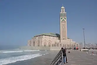 The Hassan II Mosque (Arabic: مسجد الحسن الثاني) is a mosque in Casablanca, Morocco. It is the second largest functioning mosque in Africa and is the 14th largest in the world. Its minaret is the world's second tallest minaret at 210 metres (689 ft).[2][3] Completed in 1993, it was designed by Michel Pinseau under the guidance of King Hassan II and built by Moroccan artisans from all over the kingdom. The minaret is 60 stories high topped by a laser, the light from which is directed towards Mecca.[4] The mosque stands on a promontory looking out to the Atlantic Ocean; worshippers can pray over the sea but there is no glass floor looking into the sea. The walls are of hand-crafted marble and the roof is retractable. A maximum of 105,000 worshippers can gather together for prayer: 25,000 inside the mosque hall and another 80,000 on the mosque's outside ground.[3]