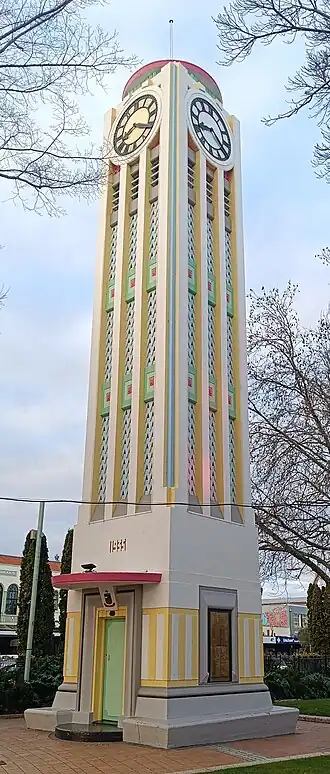 The Hastings Clock Tower is an excellent example of mid-1930s Art Deco Moderne. The tower is square in plan, and at street level there is a recessed door indicating the tower frontage. At the rear is a niche, and either side are two plaques installed in 1995 to memorialise those who died in the 1931 earthquake. The base is formed to allow for seating and congregation around the tower.[5]