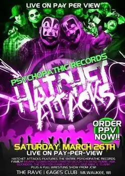 Hatchet Attacks (2011) was a professional wrestling pay-per-view (PPV) event produced by Juggalo Championship Wrestling (JCW), which was only available online. It took place on March 26, 2011, at The Rave in Milwaukee, Wisconsin.[1] Professional wrestling is a type of sports entertainment in which theatrical events are combined with a competitive sport. The buildup to the matches and the scenarios that took place before, during, and after the event, were planned by JCW's script writers. The event starred wrestlers from Juggalo Championship Wrestling's bi-weekly internet wrestling show.