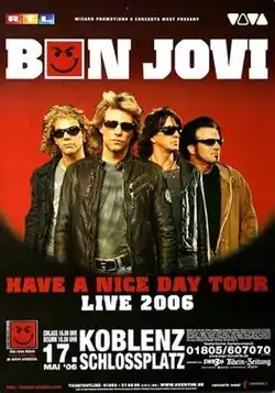 The Have a Nice Day Tour was a worldwide concert tour by American rock band Bon Jovi. It took place between November 2005 and July 2006. The tour supported their ninth studio album Have a Nice Day.
