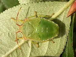 The hawthorn shield bug (Acanthosoma haemorrhoidale) is a common European shield bug.[1] Its chief food is haws, the fruit of the hawthorn tree, but adults can overwinter on a diet of leaves, and individuals can be found on many potential food plants, including pedunculate oak, sessile oak and whitebeam.[2] They may grow up to 17 mm (0.67 in) long, and are camouflaged in shades of green and brown. Like many so-called "stink bugs", they may release unpleasant odours when disturbed.[3]