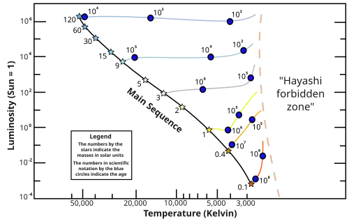 A Hertzsprung-Russell diagram displays a plot of a star's surface temperature against the luminosity. On this diagram, the Hayashi limit forms a nearly vertical line at about 2,500 K. The outer layers of low temperature stars are always convective, and models of stellar structure for fully convective stars do not provide a solution to the right of this line. Thus in theory, stars are constrained to remain to the left of this limit during all periods when they are in hydrostatic equilibrium, and the region to the right of the line forms a type of "forbidden zone". Note, however, that there are exceptions to the Hayashi limit. These include collapsing protostars, as well as stars with magnetic fields that interfere with the internal transport of energy through convection.[2]