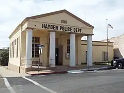 Hayden's economy began to decline as the mine veins became depleted. The crime rate rose and residents began to move out. There were also political scandals.[6][7] Businesses closed, and churches, schools and houses were abandoned or burned. The Valley National Bank abandoned its building, and it now occupied by the Hayden Police Department. According to the mayor, Bob Smith, Hayden has more police cars than police officers.[6][7]