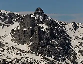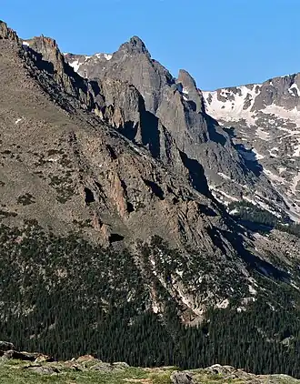 Hayden Spire is a 12,480+ foot elevation (3,800 meter) pillar located in Rocky Mountain National Park, in Larimer County, Colorado, United States.[3] It is situated 12 miles west of the community of Estes Park in Hayden Gorge, along a short spur on the Continental Divide. Hayden Spire is part of the Front Range which is a subset of the Rocky Mountains. It is the highest tower in a cluster of spires which can be viewed from Forest Canyon Overlook along the Trail Ridge Road. Topographic relief is significant as the north aspect rises 2,100 feet (640 meters) above Hayden Gulch in one-half mile. Neighbors include Terra Tomah Mountain two miles to the north, and Mount Julian 1.8 mile to the northwest.