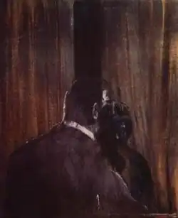The painting depicts the upper half of a male figure in a suit, in a rear quarter view facing away from the viewer, in a space shrouded with vertical bands interpreted as curtains. The figure is possibly looking in a mirror, where a simian face looks back. Like Head III, it is painted in dark tones of grey and black on a beige ground with white highlights, which in this case pick out the man's shirt collar, his neck, ear and temple. The placing of the two heads suggest the man is dissolving into the monkey, although the man is sometimes described as having a monkey on his shoulder; the low contrast between the elements have been likened to a cinematic dissolve. It may be based on a photograph.