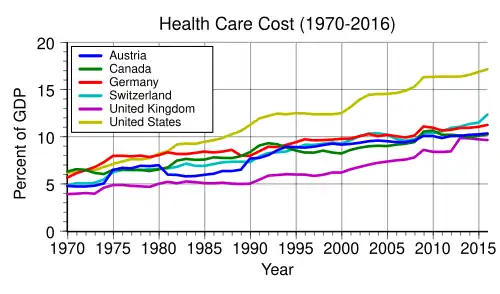 Austria's health care system was given 9th place by the World Health Organization (WHO) in their mid-2000s (decade) international ranking.[1] In 2015 the cost of healthcare was 11.2% of GDP -the fifth highest in Europe.[12]