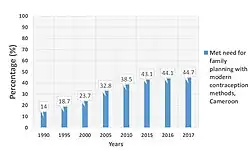 The proportion women of reproductive age (15 to 49 years) in Cameroon who have their family planning needs met with modern contraception methods increased about three folds from 14% in 1990, to 43.1% in 2015. As of 2017, still not up to half of women of reproductive age have their family planning needs as met as the percentage stands at 44.7%.[21] However, progress has been globally even though slowly from 74% in 2000 to 76% in 2019.[16]