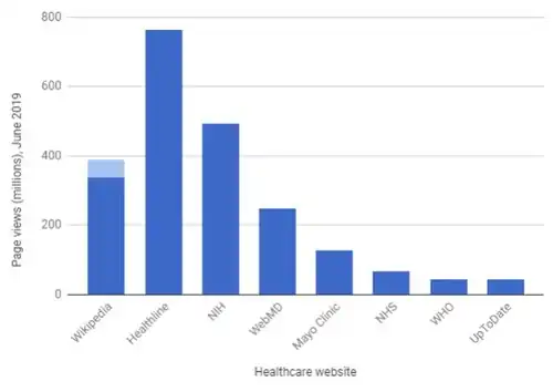In July 2014, Wikipedia's medical content in all languages was viewed more often than any other popular healthcare website, including the NIH, WebMD, Mayo Clinic, NHS, WHO, and UpToDate.[4][52] Some doctors have described their use of Wikipedia as a "guilty secret".[53]