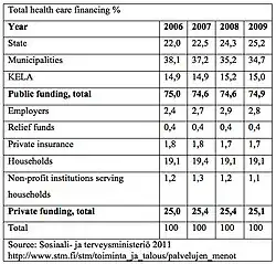 - ^ "Health Expenditure and Financing in 2009". National Institute for Health and Welfare. Archived from the original on 2012-04-23. Retrieved 2011-12-13.